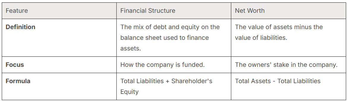 It's easy to mix up financial structure and net worth, but they represent different aspects of your company's finances. Your financial structure is the combination of all liabilities and equity used to fund your assets. It’s about how your business is capitalized.